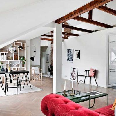 El sofá de terciopelo rojo, la repisa geométrica y el entretenido espacio para las leñas, son algunos de los increíbles detalles que este Penthouse minimalista posee… y son estos mismo detalles los que le dan vida, carácter y estilo al lugar.