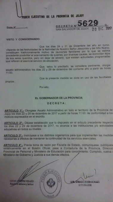 Mediante el decreto 5629, el ejecutivo provincial determinó asueto provincial para los días viernes 22 y viernes 29 de diciembre a partir de las 11.00, en todo el territorio provincial.