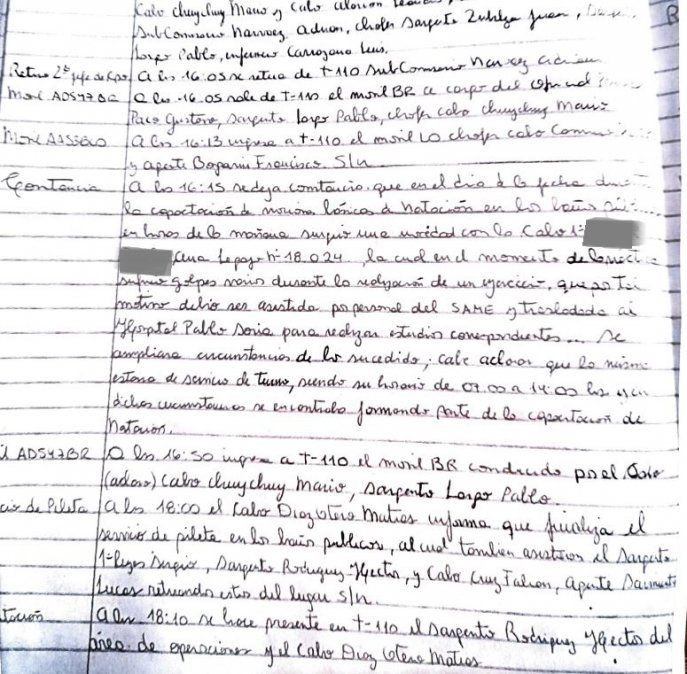 En el libro de novedades de las fuerzas de ese 24 de febrero con folio 186, se deja constancia que a las 16:15 de ese día, mientras se desarrollaba la capacitación de nociones básicas de natación en la pileta de los Baños Públicos, “en horas de la mañana surgió una novedad con la Cabo l.P. , legajo xxxxx, la cual en el momento de la práctica sufrió golpes varios durante la realización de un ejercicio , que por tal motivo debió ser asistida por personal del SAME y trasladada al hospital Pablo Soria para realizar estudios".