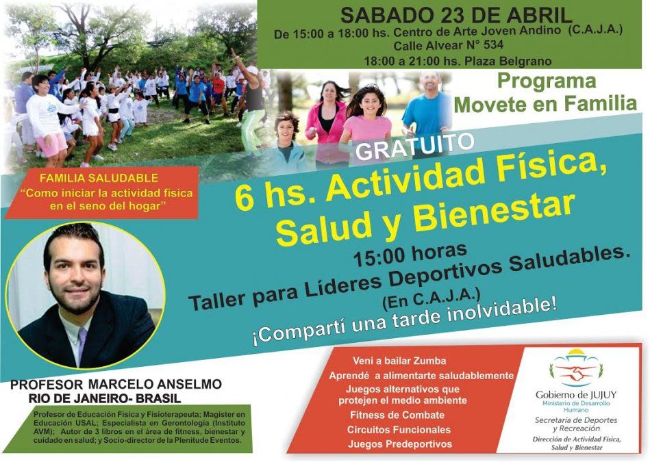 La cita será a partir de las 15hs en instalaciones del Centro de Arte Joven Andino, ubicado en calle Alvear 534. Comenzará con una charla saludable a cargo del profesor Marcelo Anselmo de Río de Janeiro (Brasil), de amplia trayectoria profesional en el área, con la temática “Familia Saludable, como iniciar la actividad física en el hogar”. La misma se extenderá hasta las 18 horas para luego continuar con actividades en plaza Belgrano, tales como juegos recreativos, fitness de combate, circuitos funcionales, zumba.