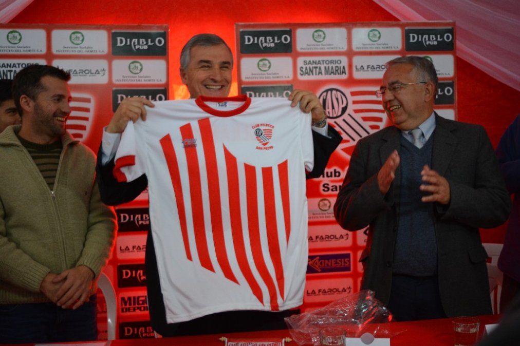 En segundo, lugar, la comitiva encabezada por Gerardo Morales y Julio Bravo, se trasladó hacia las instalaciones de Club Atlético San Pedro. Allí, se entregó al vicepresidente del Club Millonario, un subsidio de $150 mil pesos, correspondiente al primer trimestre del año 2016. Del mismo modo, deportistas de la institución entregaron obsequios al Gobernador Morales, quien también recibió una camiseta de fútbol del Club con su nombre estampado.