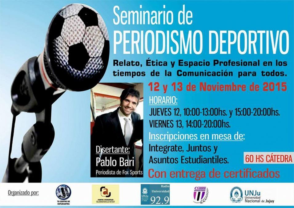 Los días jueves 12 y viernes 13 de noviembre se llevará a cabo el Seminario de Periodismo Deportivo en la Facultad de Humanidades, sito en Otero 262, donde disertará Pablo Bari, periodista de Fox Sports.