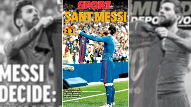 El periódico Sport, de Barcelona, con la misma foto en la portada, tituló "Sant-MessI" y apuntó que "Leo asaltó el Bernabéu. El crack le dio la victoria a su equipo en el minutos 92. Lo celebró enseñando su camiseta a toda la afición y la Liga sigue viva".