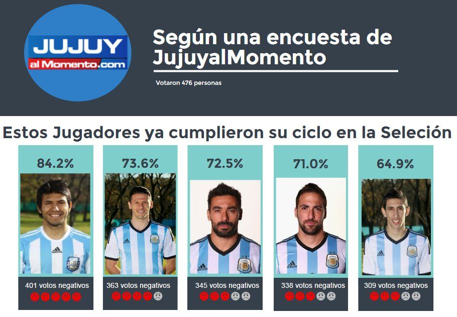 La encuesta realizada por JujuyalMomento.com arrojó que los jugadores más resistidos del combinado nacional son: Sergio Agüero, Martín Demichelis, Ezequiel Lavezzi y Gonzalo Higuaín.