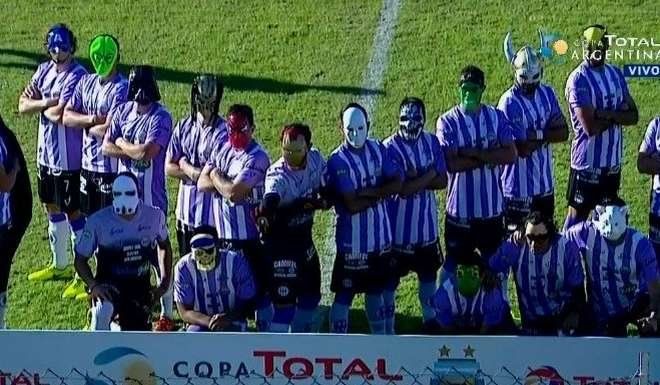 Los jugadores de Sacachispas salieron al duelo contra Arsenal por Copa Argentina usando máscaras de superhéroes y así posaron para la foto, no es la primera vez que hacen este tipo de cosas.