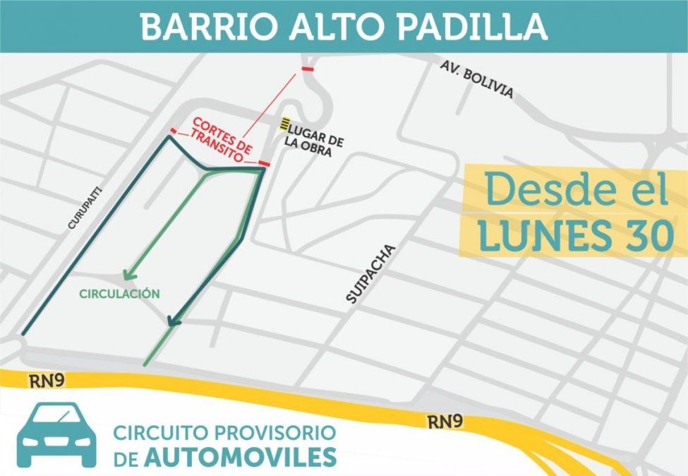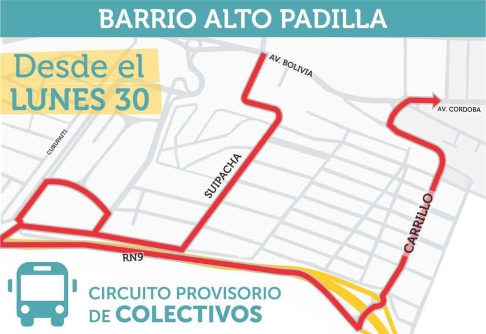Respecto del circuito de colectivos, el ingreso al barrio Alto Padilla se hará por la calle Comandante Pedro Pérez, que, más adelante cambia al nombre de Suipacha, mientras que las paradas de colectivos no sufrirán cambios.