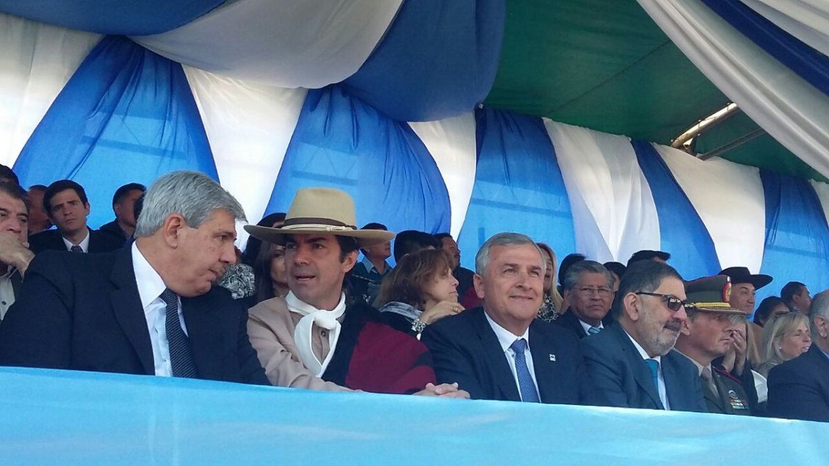 Tras dialogar brevemente con la prensa, el mandatario salteño se subió al palco para sumarse a las autoridades jujeñas que observan el desfile.