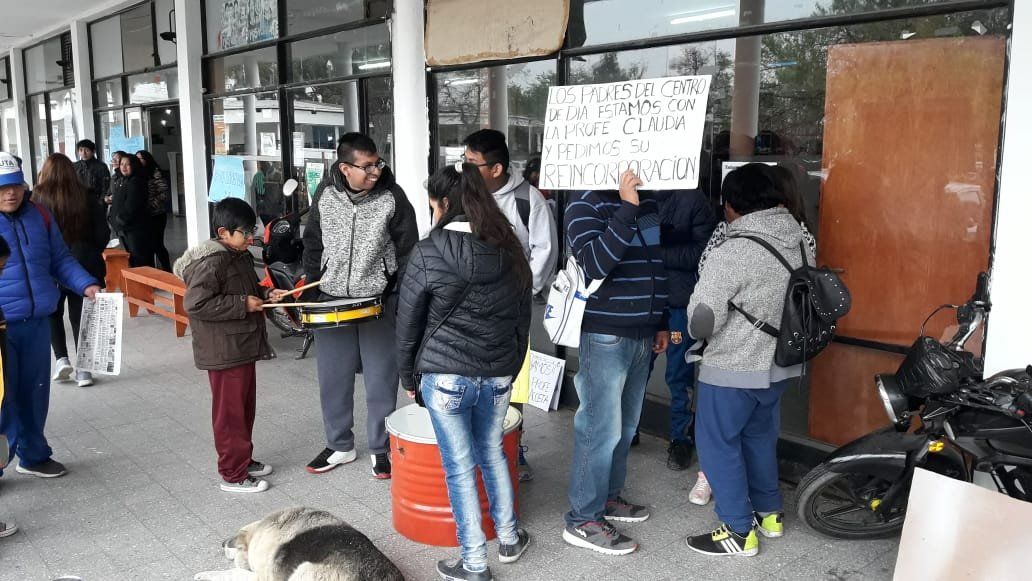 Durante la mañana, miembros de la juventud del SEOM junto a personas niños y adultos que asisten al Centro de Día “Oscar López” se manifestaron en el Centro Cívico por el despido de docentes que trabajan en el lugar.