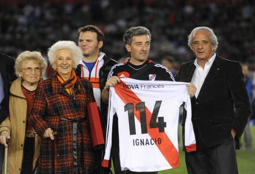 Ignacio estuvo acompañado por su abuela Estela, titular de las Abuelas de Plaza de Mayo, Rosa Roisinblit, vice de la misma entidad, y el nieto Guillermo Pérez Roisinblit, quienes también fueron agasajados por la institución 'Millonaria'.
