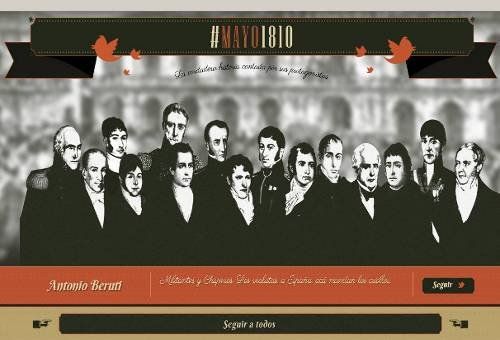En el sitio http://www.revolucion1810.com.ar/ se pueden seguir las “conversaciones entre los próceres a través de twitter”. Allí hay un muro donde transcurren todas las conversaciones, pero también se pueden segur las cuentas de cada uno de los próceres de mayo.
