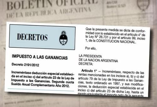 "Increméntase, respecto de las rentas mencionadas en los incisos a), b) y c) del artículo 79 de la Ley de Impuesto a las Ganancias, texto ordenado en 1997, y sus modificaciones, la deducción especial establecida en el inciso c) del artículo 23 de dicha Ley, hasta un monto equivalente al importe neto de la segunda cuota del Sueldo Anual Complementario", dispone el artículo 1 del decreto.