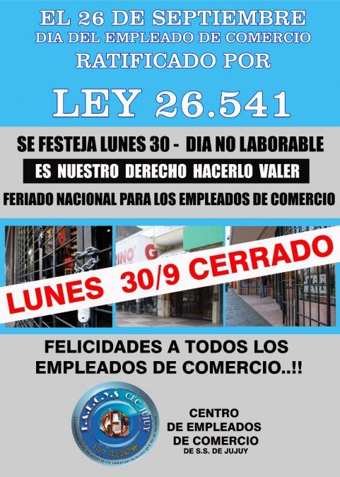 El Centro de Empleados de Comercio (CEC) ya envió una circular en la cual insta a los comercios "a cerrar sus puertas ese día, en todo el ámbito provincial, en cumplimiento con lo ordenado por la Ley 26.541".