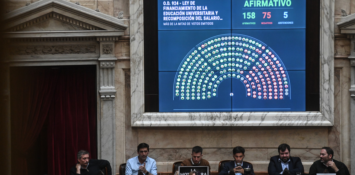 La oposición logró este miércoles en la Cámara de Diputados dar media sanción a un proyecto que apunta a reforzar y garantizar el financiamiento de las universidades nacionales. Fue la primera votación de una mega sesión incómoda para la Casa Rosada que también incluye en el temario la declaración de emergencia en pediatría -por la crisis del hospital Garrahan- y las iniciativas patrocinadas por los gobernadores para coparticipar el impuestos los combustibles líquidos y para repartir de forma automática los Aportes del Tesoro Nacional.