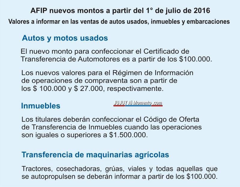 En tanto la AFIP también actualizó los montos del Régimen de Información de operaciones de compraventa de automotores y motos usadas. Los nuevos valores son a partir de los $ 100.000 y $ 27.000, respectivamente.