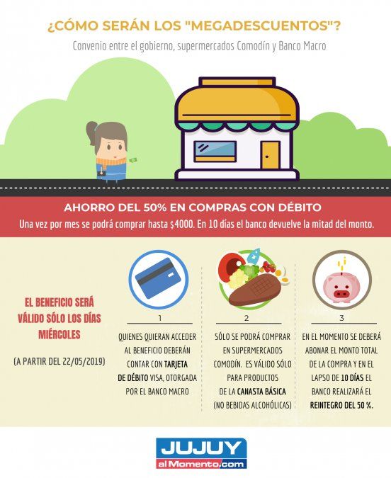 Alrededor de 200.000 personas en Jujuy, al ser clientes del banco Macro, poseen una tarjeta de débito. Con la misma, podrán concurrir los días miércoles a cualquiera de las 15 sucursales de supermercados Comodín y adquirir productos de la canasta básica hasta un valor de $4.000.