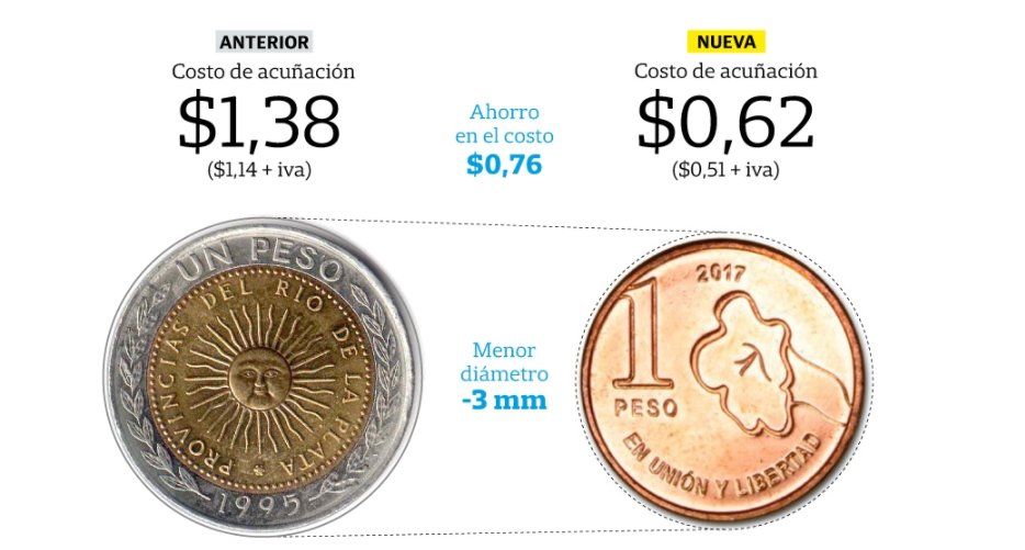 La paradoja monetaria finalmente llegó este 2018. Si un argentino quisiera comprar a costo de producción una moneda de un peso debería pagar 1,14 más IVA, es decir, 1,38 pesos. La nueva pieza forma parte de la nueva familia de monedas, "Árboles de la República Argentina", compuesta por cuatro denominaciones de 1, 2, 5 y 10 pesos, con las imágenes del jacarandá, el palo borracho, el arrayán y el caldén, respectivamente.