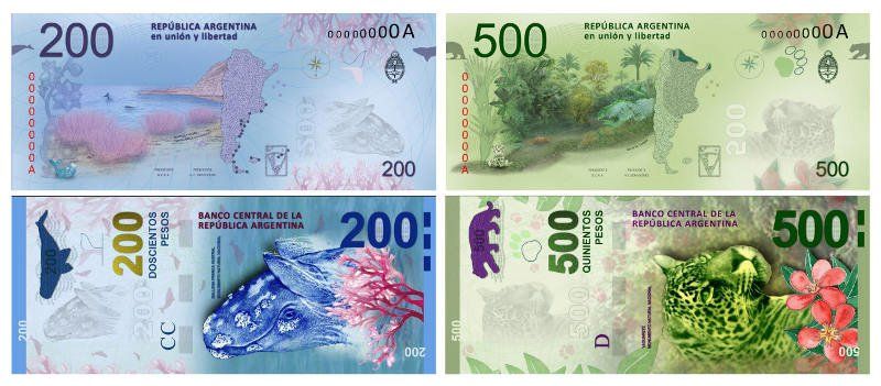 La ballena franca austral es el animal asignado para el de 200 pesos, representando a la región del Mar Argentino, Antártida e Islas del Atlántico Sur. El billete de $1.000 contará con un hornero, que es el ave nacional, mientras que el de $500 tendrá el dibujo de Yaguareté.