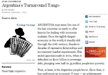 “Argentina ha recobrado su prosperidad gracias a inteligentes medidas económicas", dice la editorial del periódico neoyorquino firmada por Ian Mount quien destacó además que el gobierno argentino “intervino para mantener el valor bajo de su moneda, lo que impulsó la industria local haciendo las exportaciones argentinas más baratas afuera mientras mantenía las importaciones más caras”.