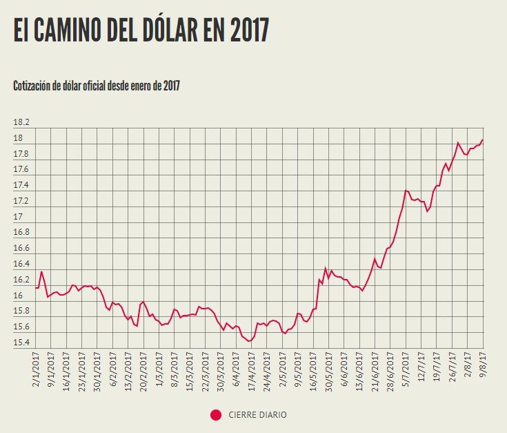 La divisa aumentó siete centavos al público, a $18,05, un nuevo máximo histórico. Desde el 28 de julio, la autoridad monetaria sacrificó USD 1.300 millones de reservas para contener la escalada.