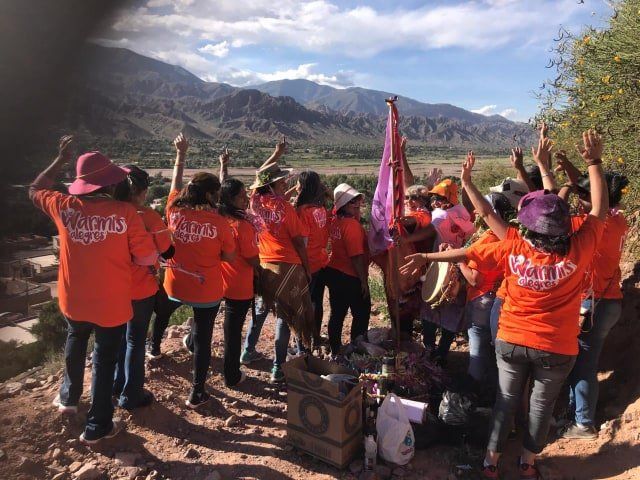 Nos sentíamos plenas. Abrazadas las unas a las otras, nos reconocíaamos, habíamos llegado desde diferentes provincias y sabíamos que somos iguales, con deseos similares. Y durante el largo almuerzo poblado de risas supimos que debíamos seguir siendo “sexis, solteras, libres y soberanas”. Cada palabra elegida entre risas y alegría con su especial significación metafórica. Ese fue el código del día que nos mantuvo unidas y felices hasta el anochecer. Cantamos, copleamos, bailamos, agradecimos a la Pachamama. En el mojón la alimentamos y nos juramos confidencias y fuerzas para no decaer. Nos nombramos madrinas de los distintos haceres para el próximo jueves de comadre: de la bandera del grupo de cada año, de las remeras que nos distinguen, de la cocina cuyos platos saboreamos, de la música que nos habita, del cariño femenino y cálido que nos acerca cada vez más.