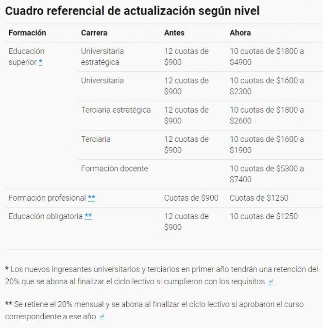 Dichas carreras son las que percibirán el mayor monto (entre $1800 a $4900) junto con las carreras de formación docente ($5300 a $7400). Los alumnos de nivel terciario percibirán un promedio de 70% más y 16% le corresponde al nivel primario-secundario en comparación con el año pasado.