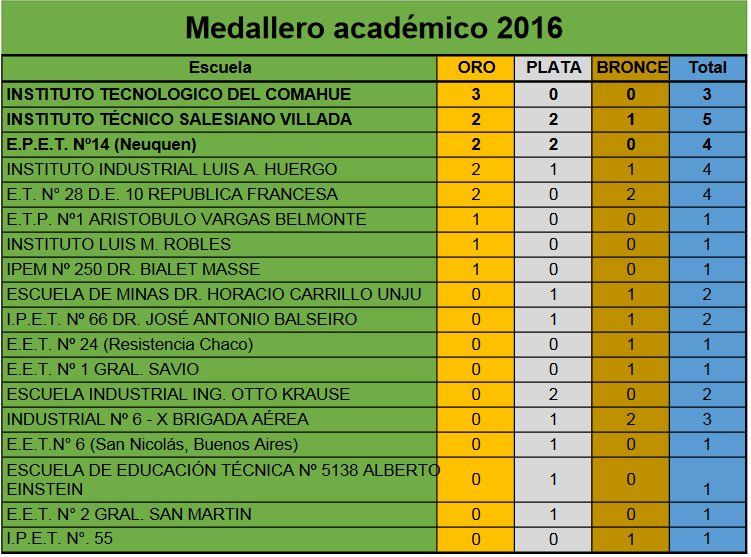 En el medallero general quedaron en la sexta posición por encima de instituciones de prestigio nacional como Escuela Técnica N°1 Otto Krause, de la Técnica Dr. José A. Balseiro, la escuela de Minas de Jujuy y la escuela Eisten de Salta.