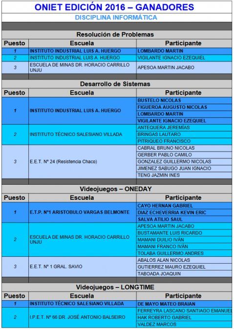 Los resultados fueron por demás alentadores para el grupo de estudiantes de la Escuela que funciona en bajo La Viña, entre los que se destacan un primer puesto en la categoría Videojuegos – ONEDAY con el excelente desempeño de Hernán Cayo, Kevin Eric Díaz Echeverría y Atilio Saúl Salva.