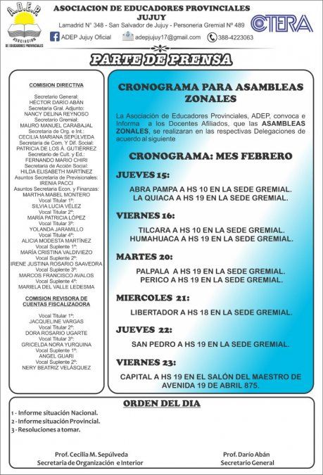 La Asociación de Educadores Provinciales (ADEP) dio a conocer el cronograma de las Asambleas Zonales que se realizarán en las distintas delegaciones, a fin de discutir la situación actual de los docentes, a nivel nacional y provincial de cara al encuentro paritario establecido para el próximo 19 de febrero.