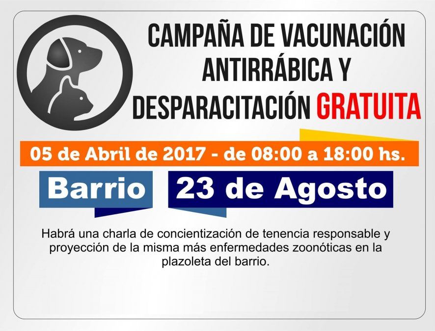 En la jornada del miércoles 5 de abril tiene lugar la vacunación antirrábica y desparasitación en el barrio 23 de Agosto, hasta las 18hs. Además habrá una charla de concientización de tenencia responsable y proyección de la misma, mas enfermedades zoonóticas en la plazoleta del barrio.