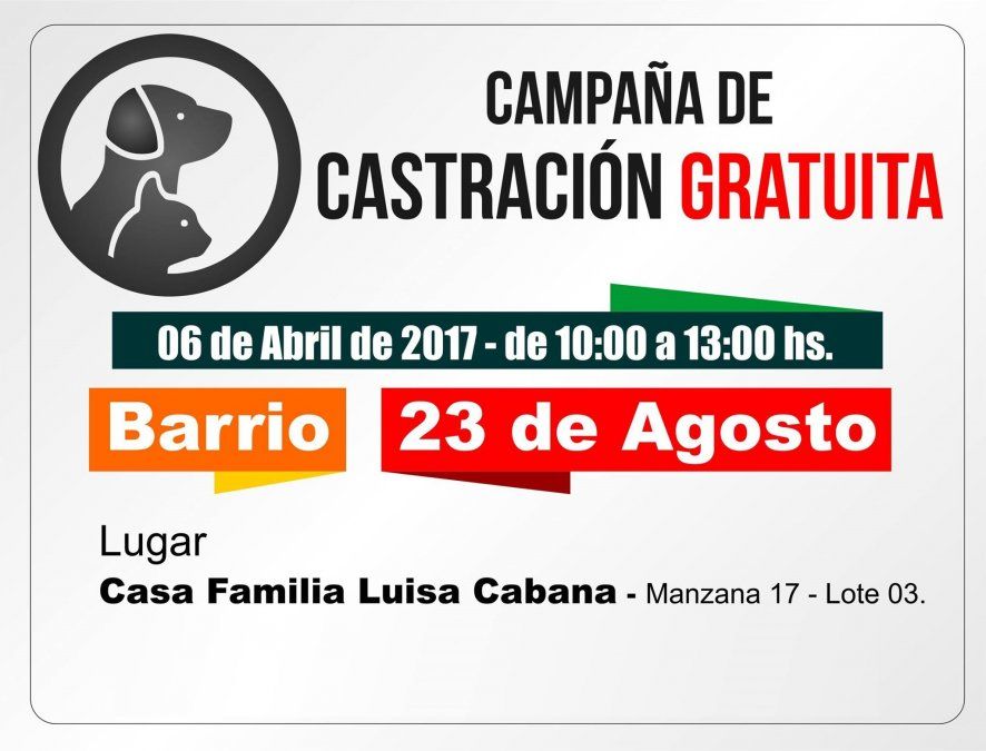 Además el jueves 6 se realiza la castración para mascotas, de 10 a 13hs. El lugar es en la casa familia Luisa Cabana ubicada en la Manzana 17, Lote 03.