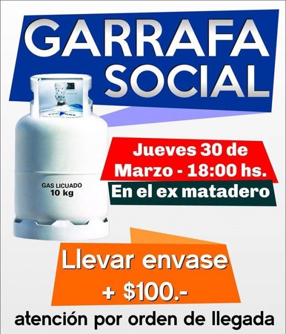 El evento tendrá lugar en el ex matadero carmense desde las 18:00hs. La garrafa es de gas licuado de 10kg, los interesados deberán llevar envase y $100, además la atención será por orden de llegada.