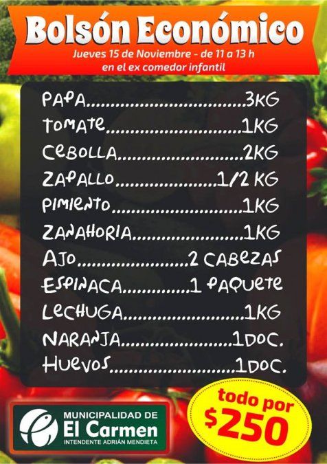 Este jueves El Carmen puso a disposición de los vecinos la venta de un bolsón con varias frutas y verduras que podían obtenerlo a un precio accesible; en el lugar se dieron cita gran cantidad de personas denotando una vez más la crisis económica de la provincia.