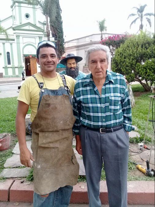Nazario Cisnero junto a su hijo Lautaro llevaron adelante la restauración de la estatua en homenaje a Jorge Cafrune, ubicada en la plaza principal de El Carmen.