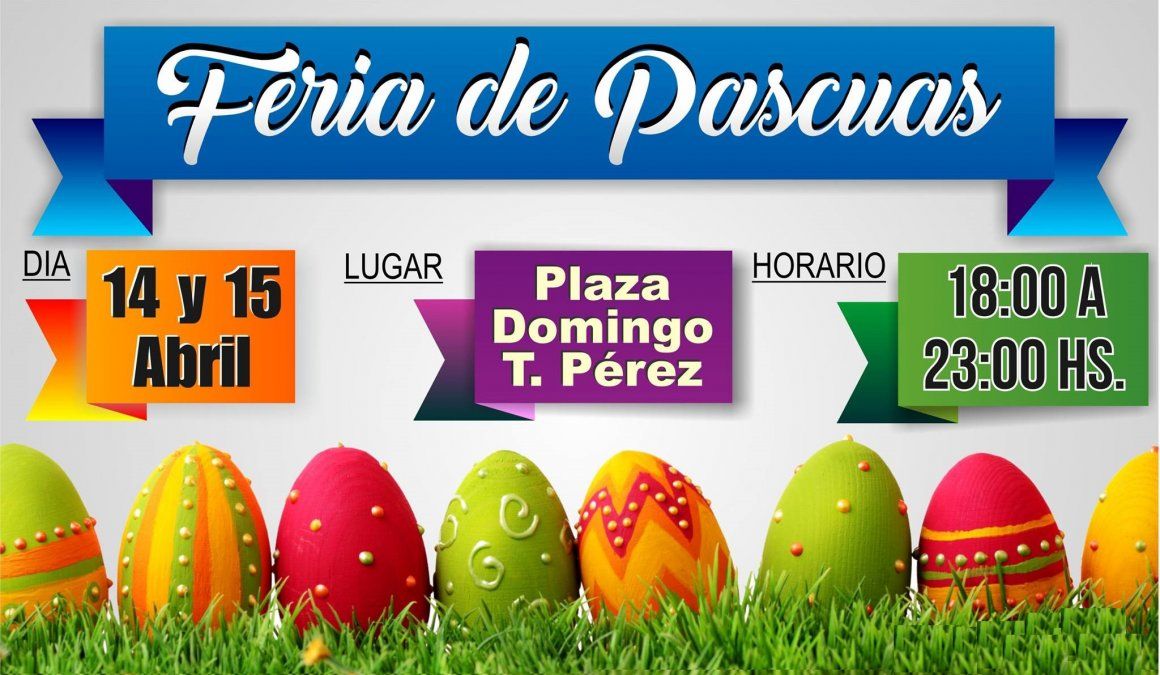 En la localidad de El Carmen tendrá lugar una feria con temática pascual, la misma se realizará en la Plaza Domingo T. Pérez, los días 14 y 15 de Abril de 18:00 a 23:00hs.
