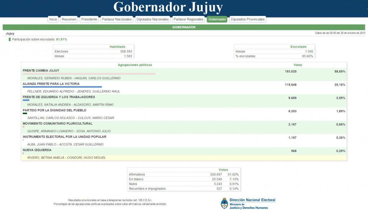 Para gobernador, la fórmula Gerardo Morales-Carlos Haquim, logró el 58,57% de los votos; mientras que Eduardo Fellner-Guillermo Jenefes el 35,36%. La diferencia llega a 23,2 puntos.
