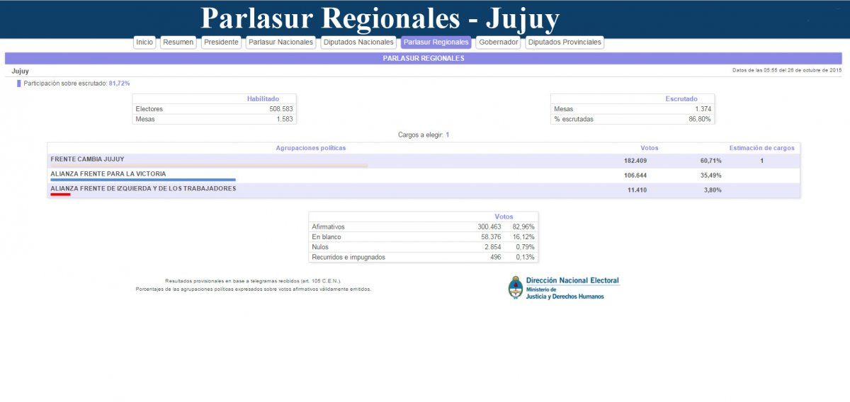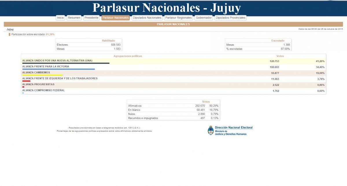 Mario Fiad será el representante de Jujuy en el Parlasur Regional al haber alcanzado con el Frente Cambiemos el 60,67% de los votos, mucho más de lo obtenido por Gerardo Morales. Atrás quedaron las aspiraciones del Frente para la Victoria que alcanzó el 35,56% de los votos y de la Alianza Frente de Izquierda que solo obtuvo un 3,77% de los votos.
