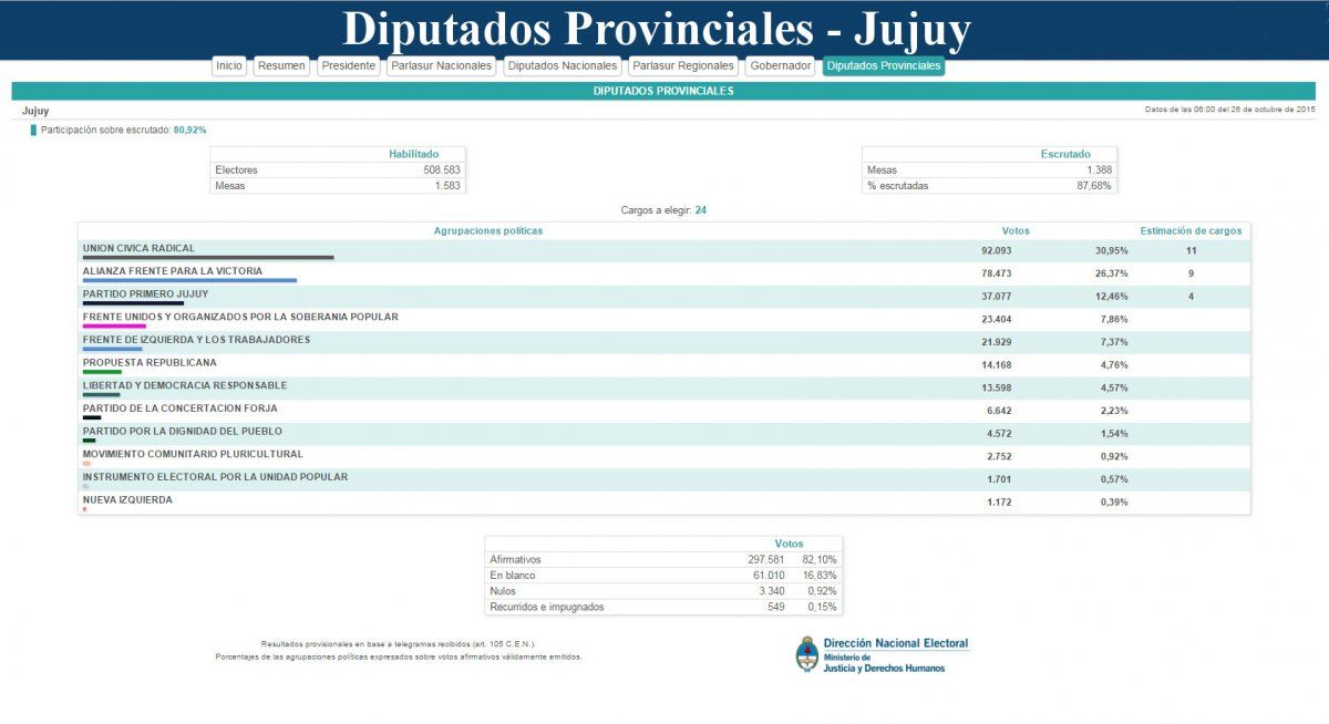 En Diputados provinciales, la Unión Cívica Radical estaría llevando a once diputados a la Cámara, al haber obtenido el 30,96% de los votos. El Frente para la Victoria, 9 diputados, con el 26,37% de los votos y el Frente Primero Jujuy 4 diputados, con el 12,47% de los votos.