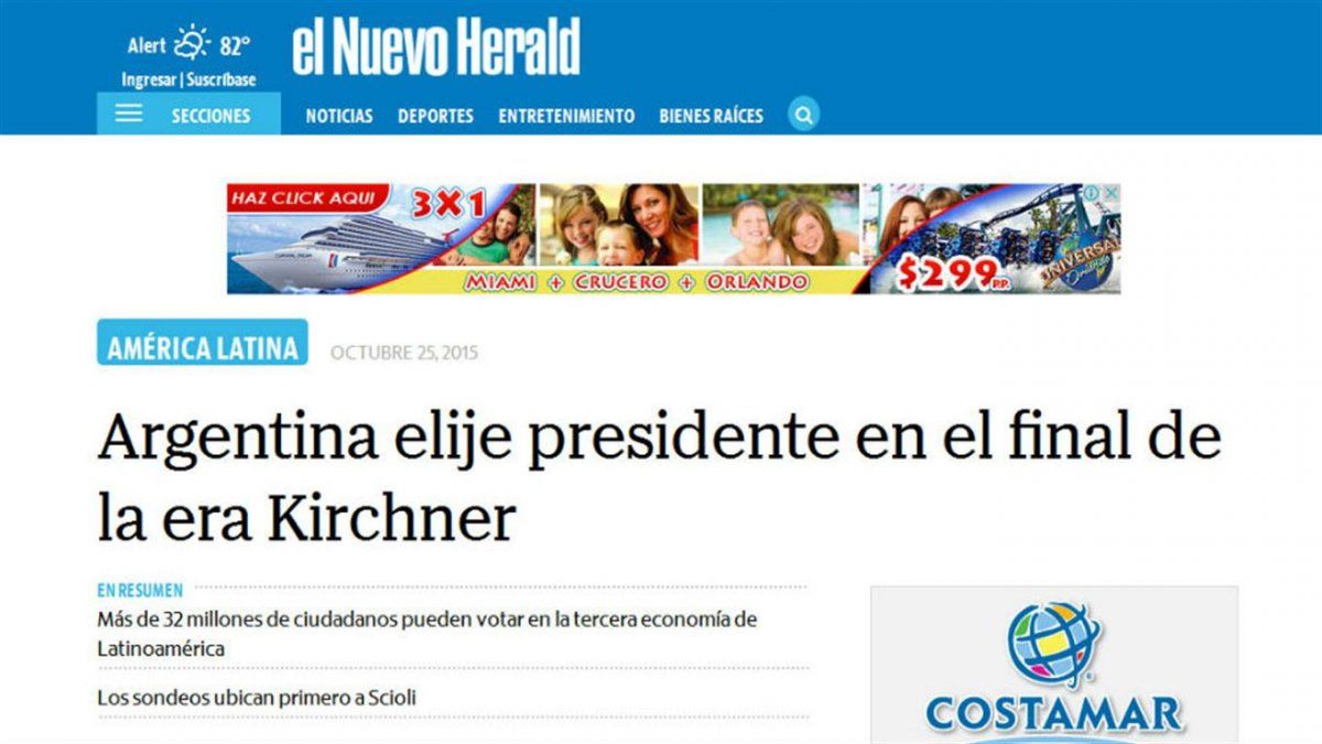 La BBC titula: "Elecciones en la Argentina: Daniel Scioli lidera las encuestas de boca de urna". Y afirma que según los últimos datos, todavía no está claro si va a ballotage", el diario El Nuevo Herald, titula en EE.UU "Argentina elije presidente en el final de la era Kirchner".