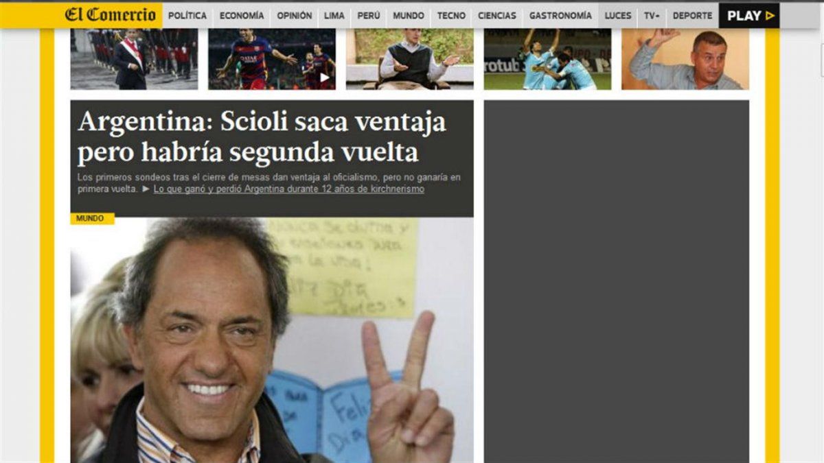 El Comercio de Perú, Argentina: Scioli gana en boca de urna y habría segunda vuelta "Los primeros sondeos de boca de urna divulgados tras el cierre de los colegios electorales en Argentina dan ventaja al oficialista Daniel Scioli, pero no con un margen suficiente para ganar en primera vuelta", informa.