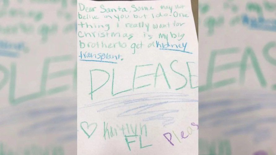 Una de las cartas, escrita con crayones verdes, azules y violetas, se destacó por la naturaleza de la solicitud. La pequeña, que firmó la misiva como Kaitlyn, le pidió al hombre de traje rojo un riñón para su hermano. En el papel, que la encargada de la tienda publicó en Facebook, puede leerse: "Algunos pueden no creer en vos pero yo sí. Lo que realmente quiero esta Navidad es que mi hermano mayor reciba un trasplante de riñón. POR FAVOR".