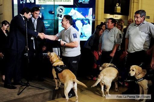 El titular de la Administración Federal de Ingresos Públicos (AFIP), Ricardo Echegaray, y el director de la Aduana, Guillermo Michel, encabezaron un acto en el que 14 canes pasaron a retiro tras muchos años de prestar servicio en el organismo.