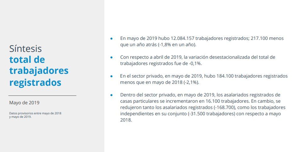 La cantidad de trabajadores registrados totalizó 12.084.157 en mayo, unos 217.100 trabajadores menos que en igual mes de 2018 informó el Ministerio de Producción y Trabajo.