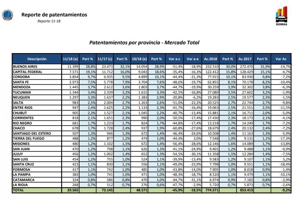A nivel país, la media también marca un derrumbe de las ventas del 45,9% en noviembre interanual y 18,5% con respecto a octubre de este año. En la consideración año a año, fueron Chaco (60,8%), Misiones (56,4%) y Corrientes (50,5%) las provincias con los mayores números en rojo. Por su parte, la vecina provincia de Salta también tuvo grandes porcentajes de caída: 51% en noviembre interanual (lo que significó 1.021 patentamientos menos) y 22,2% con respecto a octubre.