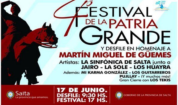La cuarta edición del festival de la Patria Grande se realizará hoy desde las 17, con la actuación de artistas de primer nivel, en la intersección del Paseo Güemes y avenida Bicentenario de la Batalla de Salta (ex Virrey Toledo) organizado por el Gobierno de la Provincia de Salta.