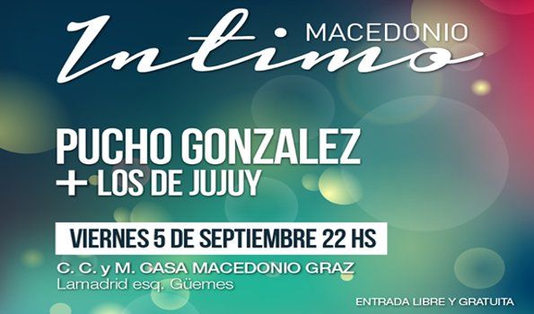 La Secretaría de la Cultura de la Provincia lanzará desde este viernes el tercer ciclo de “Macedonio intimo” en el marco de programa provincial “Jujuy Suena”. En este mes de septiembre el nuevo anfitrión será “pucho” González, quien se presentara por estos próximos cuatro viernes junto a músicos jujeños invitados especialmente para cada gala.