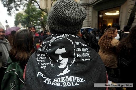 El féretro cerrado, ubicado en el hall del primer piso del edificio comunal, estuvo dominado por una enorme foto del creador en blanco y negro y rodeado por cuatro coronas, una de ellas enviada por su colega Fito Páez.