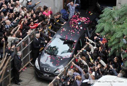 La llegada ocurrió una hora más tarde de haber salido de la Legislatura en medio de un gentío abigarrado que disimuló el aguacero haciendo llover flores sobre el cortejo fúnebre.
