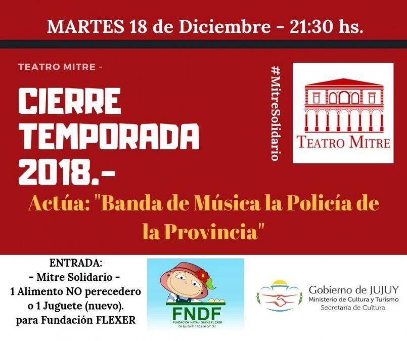 Luego de un año intenso de actividades y funciones, el coliseo jujeño cierra su temporada este martes, a las 21.30, junto a la Banda de Música de la Policía de la provincia. La entrada es libre y gratuita, pero se solicitó la colaboración de alimentos no perecederos o juguetes nuevos, que serán destinados a niños con tratamiento oncológico.