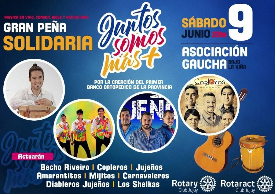 Este sábado 9 de junio, a las 22.00, la Asociación Gaucha Bajo La Viña será el lugar elegido para la Peña Solidaria "Juntos somos más", organizada por el Rotary Club Jujuy. Se presentará una destacada grilla de artistas con el fin de recaudar fondos para la creación del primer banco de elementos ortopédicos de Jujuy.
