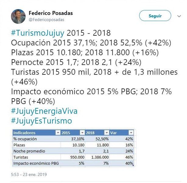 El ministro de Cultura y Turismo, Federico Posadas, tuiteó el miércoles 23 en su cuenta oficial datos sobre la ocupación turística, plazas, pernocte, cantidad de turistas y el impacto económico en el período 2015-2018.